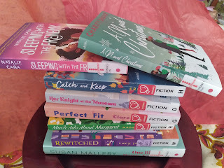 [a book stack of 8 books from top to bottom: A Novel Christmas, Sleeping with the Frenemy, Catch and Keep, Her Knight at the Museum, Perfect Fit, Much Ado About Margaret, Rewitched, One Big Happy Family]
