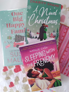 [3 books face-up from left to right, then down: One Big Happy Family, A Novel Christmas, Sleeping with the Frenemy; all arranged against a backdrop of hearts gift wrap]