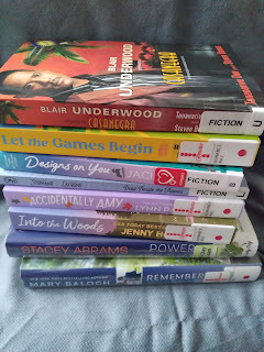 [a bookstack of 8 books from top to bottom: Casanegra, Let the Games Begin, Designs on You, Dead Beside the Thames, Accidentally Amy, Into the Woods, Power of Persuasion, Remember When]