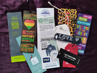[6 actual bookmarks and 5 improvised bookmarks: East City Book Shop, Old Town Books, "Black History Month", Prince George's County Memorial Library System, Anne Arundel County Public Library, 5 clothing tags from assorted brands, "Welcome to the Library" with welcome in various languages]