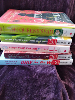 [a book stack with 5 books from top to bottom: The Queen's Spade, Adam & Evie's Matchmaking Tour, First-Time Caller, Duchess Material, Only for the Week; all arranged against a background of crushed velvet fabric]