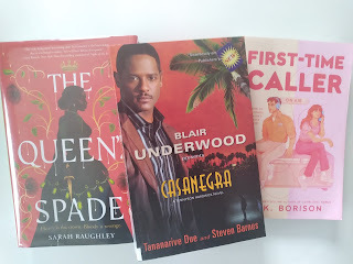 [3 books arranged next to each other from left to right: The Queen's Spade, Casanegra, First-Time Caller]