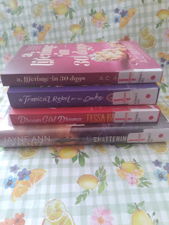 [a bookstack of 4 books from top to bottom: A Lifetime in 30 Days, A Tropical Rebel Gets the Duke, Dream Girl Drama, Shattering Dawn; books arranged against a floral background featuring whole and sliced lemons and oranges on a gingham pattern]