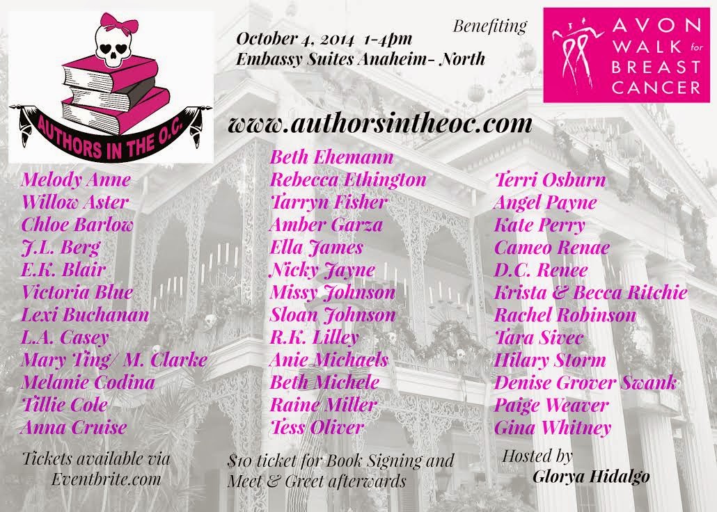 $10 ticket for the Authors in the OC book signing and Meet & Greet afterwards. Event benefits the Avon Walk for Breast Cancer via the Fifty Shades of Pink team. October 4, 2014 Embassy Suites Anaheim - North 1-4pm Book Signing 5-'Till we can't hang Meet & Greet