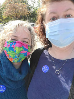 Complete with masks and stickers.So, we did the thing. My friend Anne and I went to vote in person on November 3rd around lunchtime, and due to my county having about sixty-eleven polling places we were the only folks there. Compared to the long lines I saw on telly for literally everywhere else and the stories from my friends about 2+ hour waits, we were pretty lucky. I didn't have pearls to wear for RBG or Chucks for Kamala Harris, but I wore some of my VERY PROFESSIONAL CLOTHES in black and blue and jeans. It felt like we were joining the rest of our country, picking up our feet and letting our votes carry us along on the blue wave that I was certain would be wiping out the pain of the last four years.