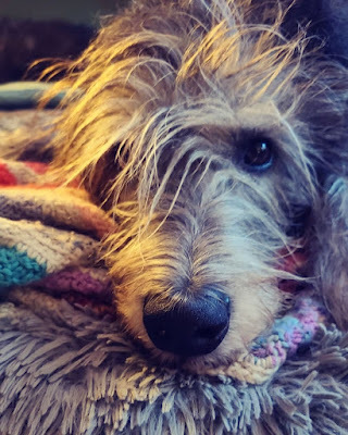 If I wasn't grateful that my dear friend Heather rang us to see if we could foster a 14-month-old Irish Wolfhound who needed re-homing through no fault of her own, I wouldn't be missing the wide-eyed, fuzzy head in that photo.