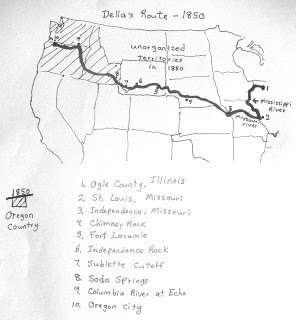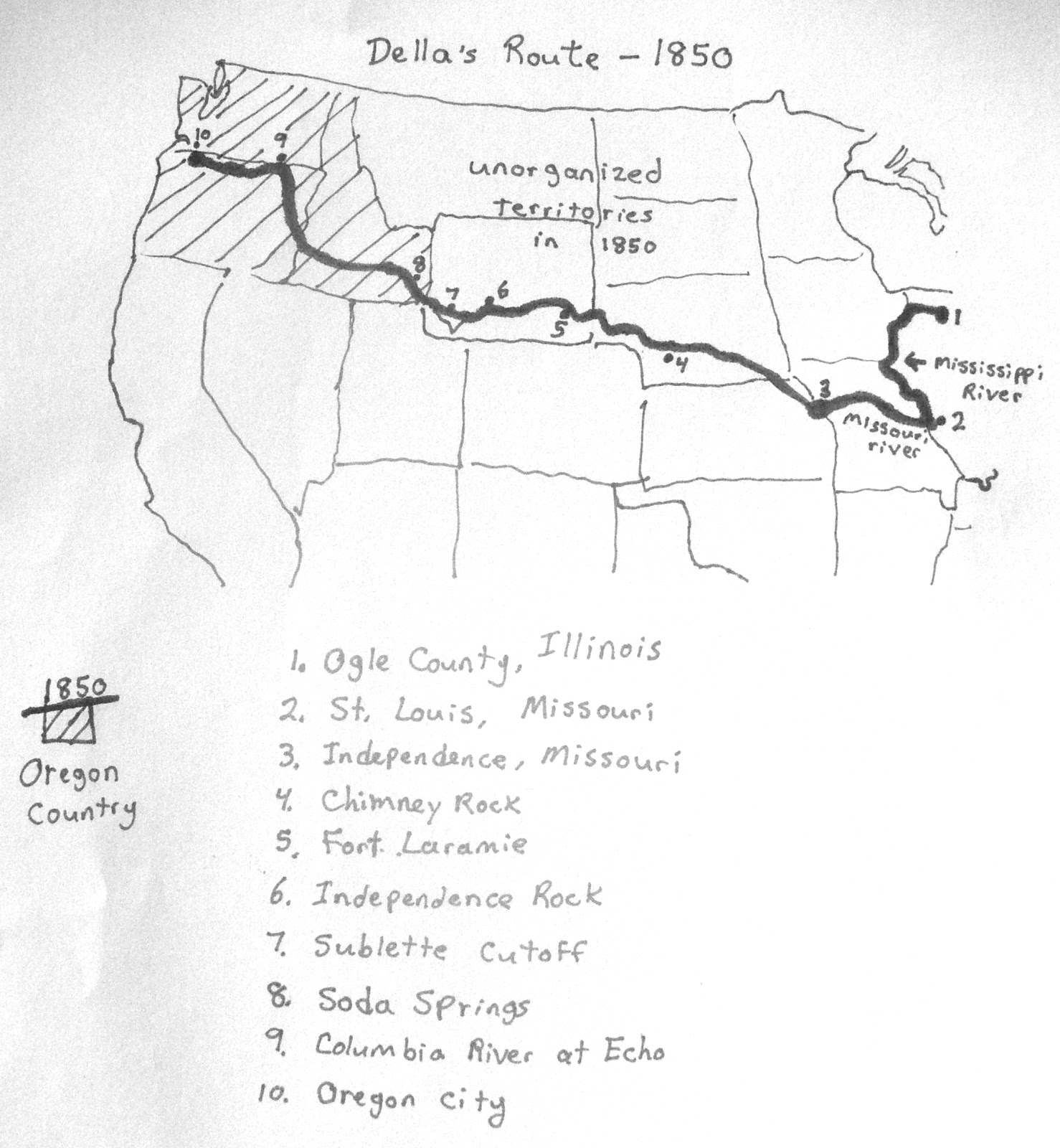 Traveling in 1850, Della, age 15, has already traveled from Northern Illinois to St. Louis, then a week by steamboat on the Missouri river. She stopped in Independence, MO to prepare for the journey and meet with the wagon train. She left behind her 60 year old grandmother who feels too old to attempt the trip, but who gave her a gift of a wooden lap desk. The desk is filled with paper, a small mirror, wooden handled pens with steel nibs, a metal letter opener, hair pins and a small sewing kit. Her younger brother, Orville, her father, and her pregnant mother are traveling with her. She has been asked to teach the younger children around the campfire in the evenings.