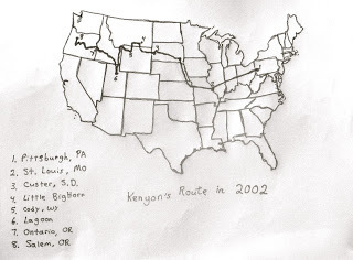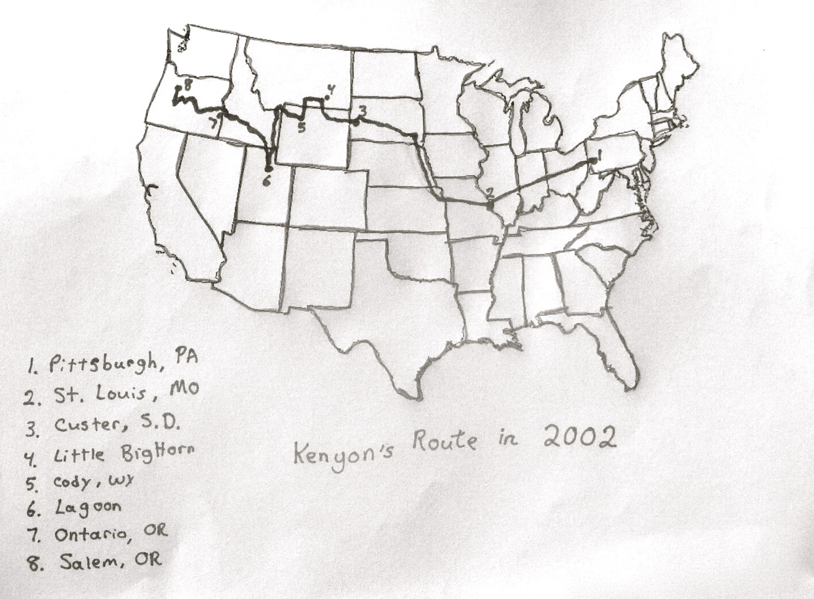 Kenyon is traveling in 2002 from Pittsburgh to Salem, OR. Her mother is pregnant and staying behind to close escrow on the house and then flying west to join the family. Kenyon; her 5 year old sister, Melissa and her father are in a Dodge Caravan, with a trailer hitch. Her Grandfather has given her a plain, black polished ebony wooden lap desk lined with a scented wood that still smells faintly of cedar. The box is filled with thick, creamy paper, envelopes, a calling card, a hand mirror, pens and pencils and a small Swiss army knife, postage and an electronic address book. Her Grandfather is not moving with them but plans have been made for him to fly out in December for a visit. Kenyon strongly resents being expected to entertain Melissa at the motels in the evenings. Her father has decided to take the long way and show his girls some of the wonders of this country and Melissa is excited but Kenyon is determined to not have any fun.
