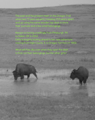 The past and present meet on the Oregon Trail when two girls travel the same trail with the same lap desk 152 years apart. Kenyon is traveling in 2002 from Pittsburgh to Salem, OR. Her mother is pregnant and staying behind to close escrow on the house and then flying west to join the family. Kenyon; her 5 year old sister, Melissa and her father are in a Dodge Caravan, with a trailer hitch. Her Grandfather has given her a plain, black polished ebony wooden lap desk lined with a scented wood that still smells faintly of cedar. The box is filled with thick, creamy paper, envelopes, a calling card, a hand mirror, pens and pencils and a small Swiss army knife, postage and an electronic address book. Her Grandfather is not moving with them but plans have been made for him to fly out in December for a visit. Kenyon strongly resents being expected to entertain Melissa at the motels in the evenings. Her father has decided to take the long way and show his girls some of the wonders of this country and Melissa is excited but Kenyon is determined to not have any fun. Traveling in 1850, Della, age 15, has already traveled from Northern Illinois to St. Louis, then a week by steamboat on the Missouri river. She stopped in Independence, MO to prepare for the journey and meet with the wagon train. She left behind her 60 year old grandmother who feels too old to attempt the trip, but who gave her a gift of a wooden lap desk. The desk is filled with paper, a small mirror, wooden handled pens with steel nibs, a metal letter opener, hair pins and a small sewing kit. Her younger brother, Orville, her father, and her pregnant mother are traveling with her. She has been asked to teach the younger children around the campfire in the evenings. What happens when they open the desk to see the other girls journal?
