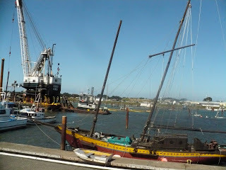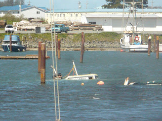 Crane on a barge come to hoist tsunami sunken ships from the Crescent City boat basin.