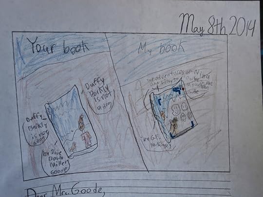 I think your the best substitute teacher in the world.! I mean, we're both writers so I love hearing about your books and reading them! Oh, and I have great news for you! remember, "Duffy Barkley is not a Dog"? Well, I'm writing a story with the same Oz/Narnia concept. It's called "the Adventures of Nina and Lilly 1# Portal in the Mountain side" It's basically about talking mountain lion named Nina, and her hymn best friendLilly going on all these adventures but something always goes wrong. Happy Book Making!"