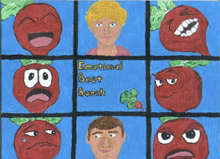 However, I am not pop-culturally aware enough to understand the reference here. "Emotional Beet Bunch?" Are they one beet making six different faces? Or six different emotional beets, kind of like the Seven Dwarves? And are those people supposed to then be Snow White and Prince Charming? More importantly, is that beet on the right in the middle flirting with me? If so, his girlfriend in the bottom right corner has a problem with that.