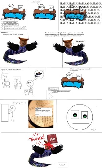 My heterosexual platonic life-partner and I were watching some show and heard the word "contrarian", and we could not believe that this was an actual word. It sounded too much like a mystical beast, and so we began to develop a children's book series about the Contrarian, who was naturally contradictory, and he lived in the Vagina Tree (different story entirely) and fought an enemy whose origins and mystical nature we had not fully imagined (or partially imagined, or imagined at all). Anyway, then the events pretty much follow the comic to a science. Reality killed my fiction! Super sad.