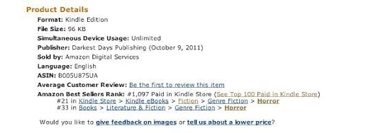 Pretty good, right? Well, it will stay up there for a day or two and then slowly slip down the ranks (as unknown books by unknown authors do), replaced by the good-old standbys by established authors and the classics. I passed Dracula and Amanda Hocking, but they'll slip by me again soon.