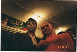 Back to me... as you can see from the first picture, I liked dressing as a zombie for Halloween. Why? Not out of any innate love of zombies. It was... well... cheap. New Orleans is filled with thrift shops, and an old suit could be had for $10 or $15. And makeup was $5. Even a pre-bagged vampire costume was more expensive. So for four years in a row, I was a zombie. My Junior year, I didn't even have to buy a used suit- I got a pair of scrubs for free at the hospital where I volunteered. And I was a zombie doctor.
