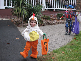We had a great time trick-or-treating. My son was Optimus Prime, my daughter was, as previously noted, a chicken. She basically ran around all night screaming "Bok bok!" And now my wife and I get to steal all of the chocolate because both kids are allergic to milk.