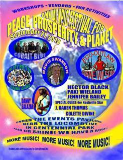 Speakers will include David Swanson (peace writer), Hector Black (advocate for peace and forgiveness), Paki Wieland (Gaza flotilla, Raging Grannies), Linnet Overton (Community Food Advocates), and Diane Wilson (Code Pink). Musical performances will include MD & Cobalt Blue , Danny Salazar, the Shelby Bottom String Band , and others. We're still looking for exhibitors and vendors; contact Eric Schechter ( LeftyMathProf@gmail.com ) regarding those, or regarding other aspects of the festival.