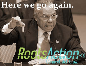 1. War is not made legal by such an excuse. It can't be found in the Kellogg-Briand Pact, the United Nations Charter, or the U.S. Constitution. It can, however, be found in U.S. war propaganda of the 2002 vintage. (Who says our government doesn't promote recycling?)