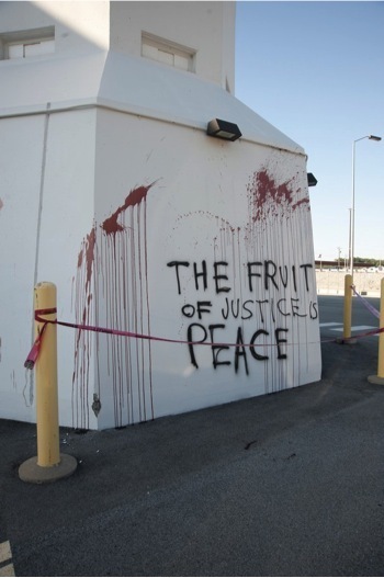 On July 28, 2012, Michael R. Walli (63), Megan Rice (82), and Greg Boertje-Obed (57) entered the Y-12 nuclear weapons plant in Oak Ridge undetected. You can't walk down the street without being filmed, but these three senior citizens were able to walk at night right up to a nuclear weapons facility. They hung up banners that read "Transform Now Plowshares" and "Swords into Plowshares Spears into Pruning Hooks–Isaiah." They strung up red crime tape. They hammered on the cornerstone of the newly built Highly-Enriched Uranium Manufacturing Facility (HEUMF), splashed human blood and left four spray-painted tags on the recent construction which read: "Woe to the empire of blood," "The fruit of justice is peace," "Work for peace not for war," and "Plowshares please Isaiah." When finally confronted by guards, they offered the guards bread and roses. They sang while forced to kneel for a long period of time.