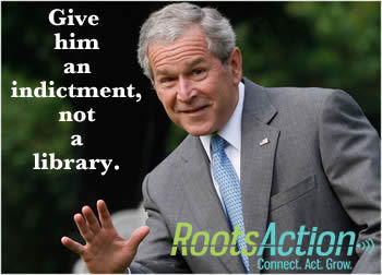 George W. Bush should be given an indictment, not a library. An online email action is letting the Department of Justice know the facts about the former president. And the People's Response to the George W. Bush Library and Policy Institute is filling the streets of Dallas with protesters this week as five current or former presidents join in a celebration of Dubya's national service. I'll certainly be there.
