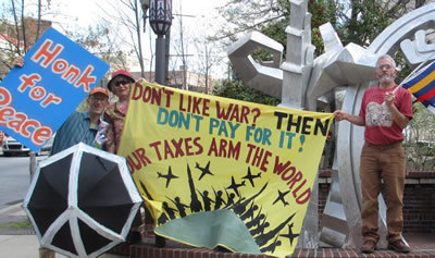 Posters carried messages including: "War steals from the poor" and "Defund Militerrorism." This in itself was not so unusual. Opponents of war often use tax season to inform their friends and neighbors that roughly half of income tax dollars go to war preparation. We could have the educations and health and happiness that other nations have if we didn't waste our money on the military, we say. We'd have more and better jobs, and jobs we could feel better about, we tell people.