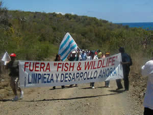 "Cleanup -- Fund a complete, rapid cleanup of the land and surrounding waters, still littered by thousands of bombs, grenades, napalm, Agent Orange, depleted uranium and other explosives left by the Navy. Cease the ongoing open detonation of unexploded ordnance. Guarantee community participation in the cleanup; train Viequenses as managers, administrators, and scientists, and foster Viequense companies to do the work.