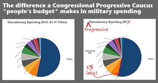 "Last year's Congressional Progressive Caucus budget proposed to cut military spending by, in my calculation, 1%. In fact, no statement from the Progressive Caucus even mentioned the existence of military spending; you had to hunt through the numbers to find the 1% cut. This was not the case in other recent years, when the CPC prominently proposed to end wars and cut particular weapons. With all due respect, how is this censoring of any mention of the military evidence of progressing, rather than regressing?"