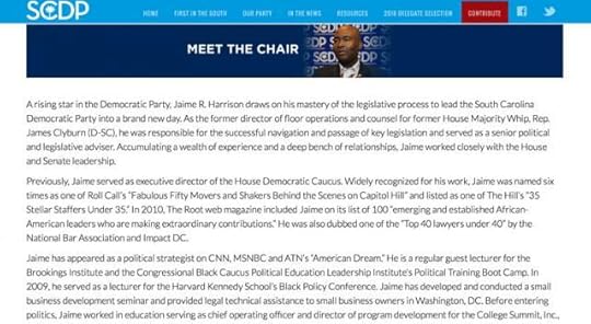 But isn't that the point, I asked? If I google Santorum I'll find something else entirely, but that's what Google shows, not what Santorum chooses to display. If everyone can find out that your paycheck comes from a Clinton-associated group, but that's left out of your bio, how does that look? Harrison promised to look into it and to make sure that it said from now on right at the top: "Jamie Harrison, chair of the South Carolina Democratic Party and Principle at the Podesta Group...."