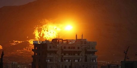Explosion from Saudi airstrike on Sanaa, Yemen.