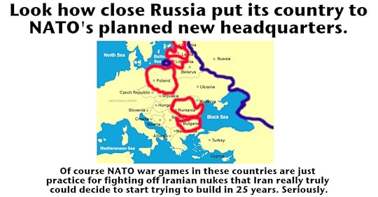 NATO is now going to open headquarters in Bulgaria, Latvia, Lithuania, Poland, Romania and Estonia -- all nations between Western Europe and Russia, all nations where the United States promised Russia NATO would never go, and all moves seen as threats by the Russian government. In fact, Russia is now putting (possibly nuclear) missiles into Kaliningrad and talking frequently about the growing likelihood of war with the United States.