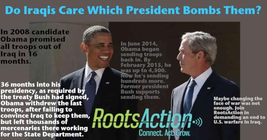 While some number of the 139 yes votes were apparently cast by Congress members wanting a chance to vote yes on more war during the next 30 days or the next 6.5 months, most were presumably cast by Congress members actually favoring withdrawal or wanting to go on record as favoring withdrawal in a vote that stood little chance of succeeding. Almost two years ago now, Congress was compelled by public pressure to indicate its intention to vote no on missile strikes into Syria. Since that time it has refused to vote wars up or down, while allowing them to be launched and waged and escalated.