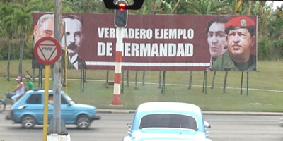 The buildings, the cars, the sidewalks look as if time stopped in 1959. The tour guide on the bus from the airport to the hotel brags that the municipality around the airport has a psychiatric hospital and a spaghetti factory. Both the billboards and the tour guide fit Fidel into most every topic.