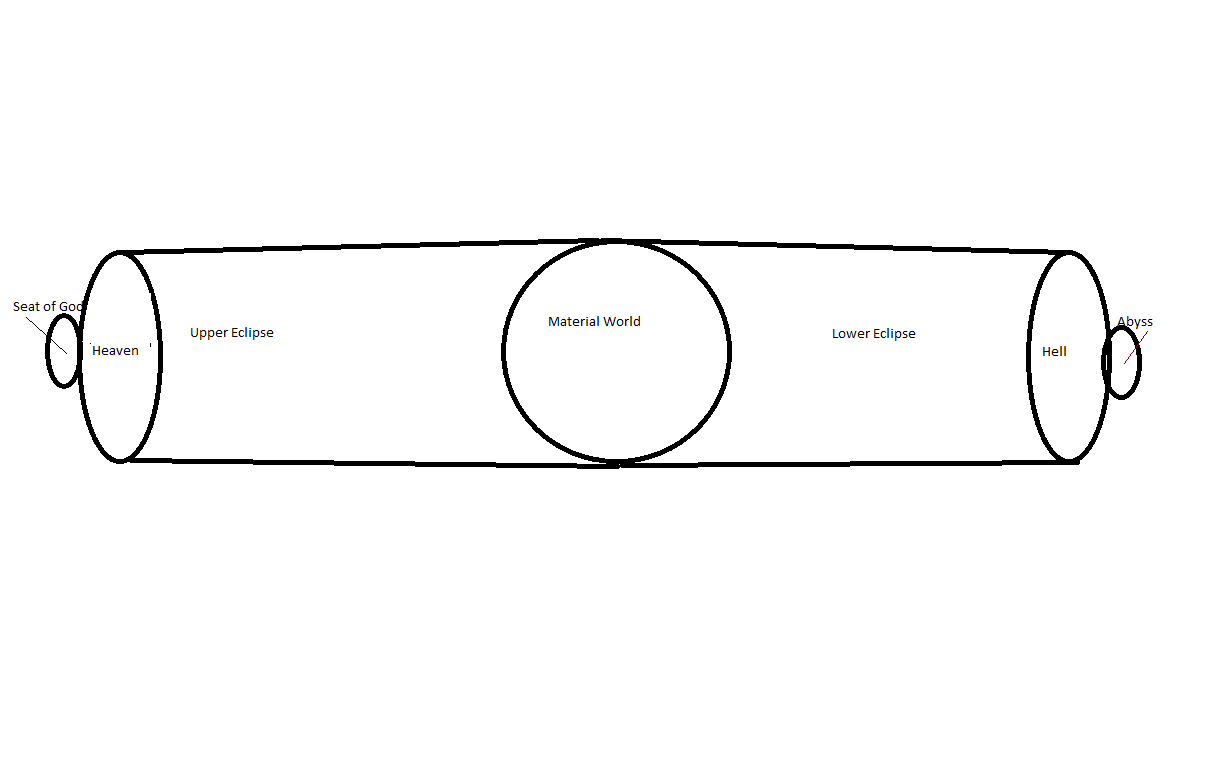In my book there are two parts to the Eclipse. There is the Upper Eclipse, where the Material Universe obscures Hell. This area is home to spirits of the higher order such as old gods of different pantheons. The Lower Eclipse where the Material Universe obscures heaven. This area is home to spirits such as darker gods, malevolent spirits, and ghosts.