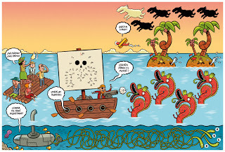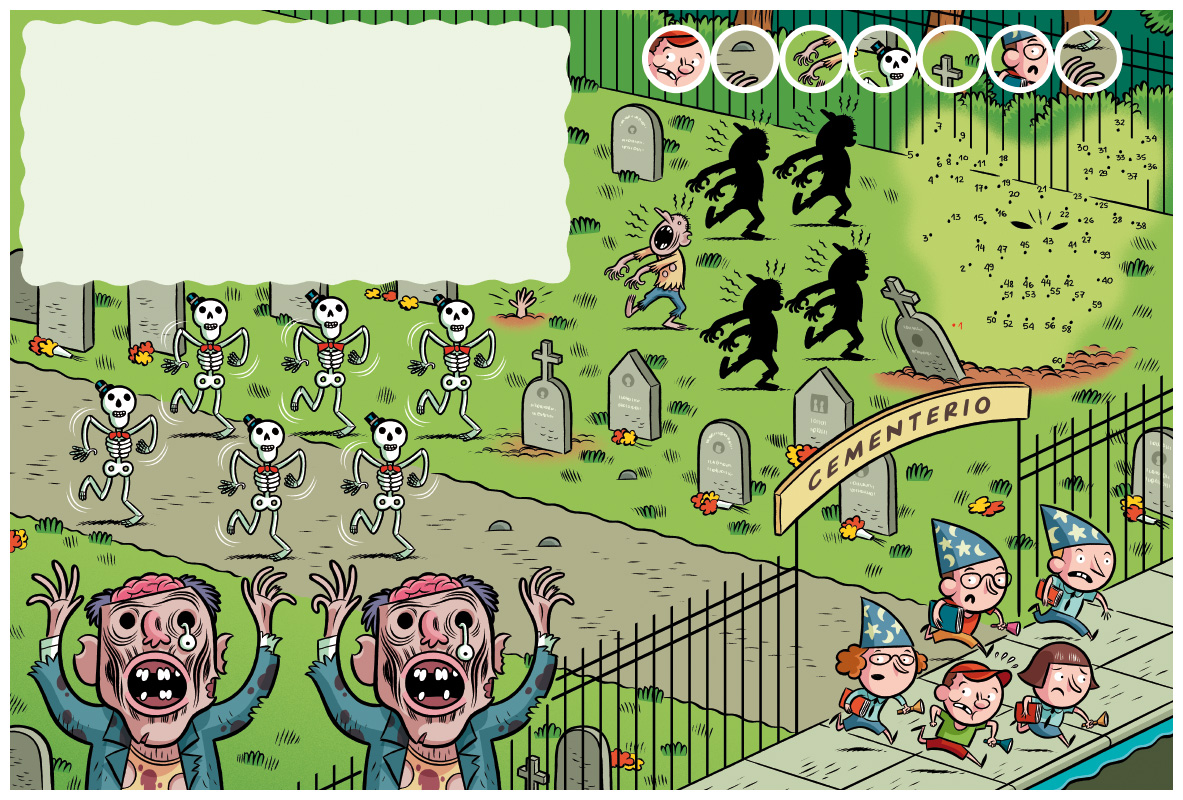 Algunos dibujos para la sección de juegos de la revista Genios. Iba a hacer dos entradas para no saturar pero mirá, las meto todas juntas. Para todos los gustos, selva, totems, piratas, dinosaurios, muertos vivos, gente bailando. De-to-do, señor, señora.