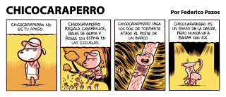 Empecé a salir con una tira en la revista Inrockuptibles, una revista para la gente joven y culta como vos y vos. La tira trata sobre Chicocaraperro, uno que tiene cabeza de perro y le pasan unas cosas.