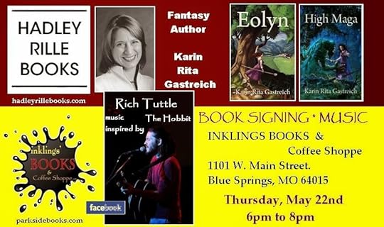 I will be at the brand new INKLINGS BOOKS & COFFEE SHOP this Thursday, May 22, starting at 6pm. Join us for an evening of pure imagination with fellow author M.C. Chambers and musician Rich Tuttle, singing songs inspired by Tolkien. Copies of Eolyn and High Maga will be available for purchase and signing.