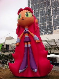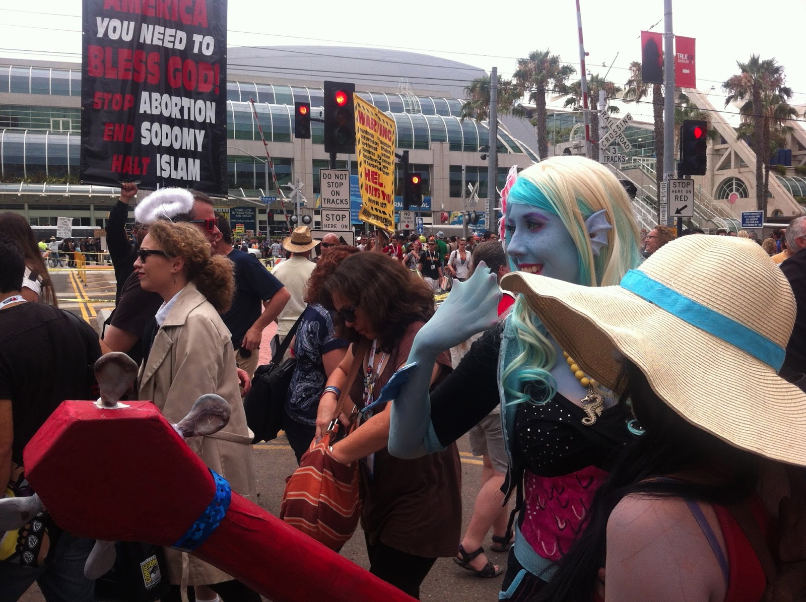 Being outside was kinda rad, where the street fair public meshed with Captain Riker annoyed and in a hurry with his Jack in the Box head. Crowds just streaming by the megaphone of this crew of tough bible dudes like they weren't even there. The guys with the zod and anti religion signs showed up and it was a shouting riot for like 20 minutes. Huge crowds of nerds shouting down the Jesus people. 20-30 people taking pictures of it - but still this mermaid girl is posing right in the middle of it, oblivious. It was like flipping through cable channels in real life. I was definitely entertained.