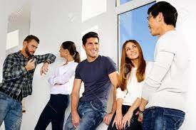 There are five people three men and two women. Where are they? Why are they there? Why are they separated into two groups? Is the couple in the background plotting against the others? Or is it as simple as him asking her on a date?