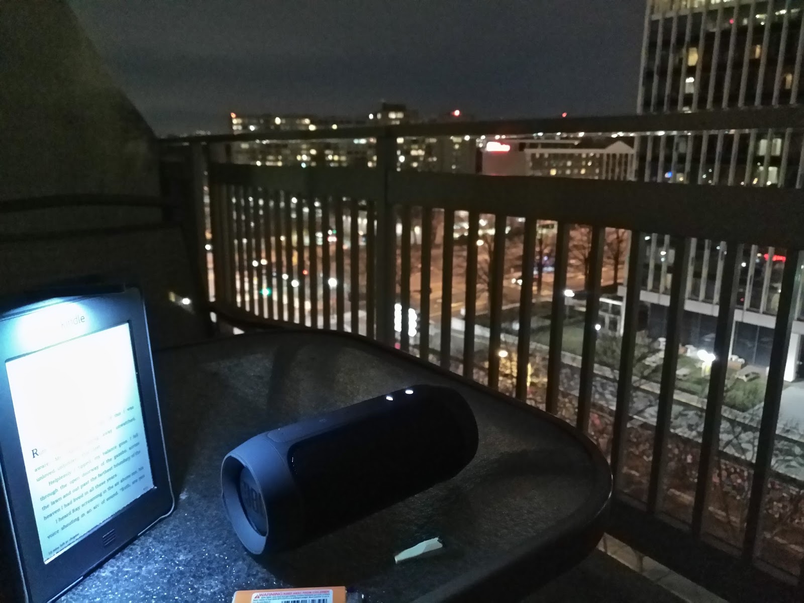Kindle Touch, JBL Charge 2+ Bluetooth speaker playing ambient instrumentals, the lights of Arlington, Virginia, and the occasional Black & Mild make for a perfectly solitary and impactful evening.While dedicating myself fully to The Lovely Bones, I thought about my next-door neighbor at my first residency, DitchedUsForIowa, who could sit/stand/pace an entire day away reading. At that time 14 months ago, I couldn’t fathom.