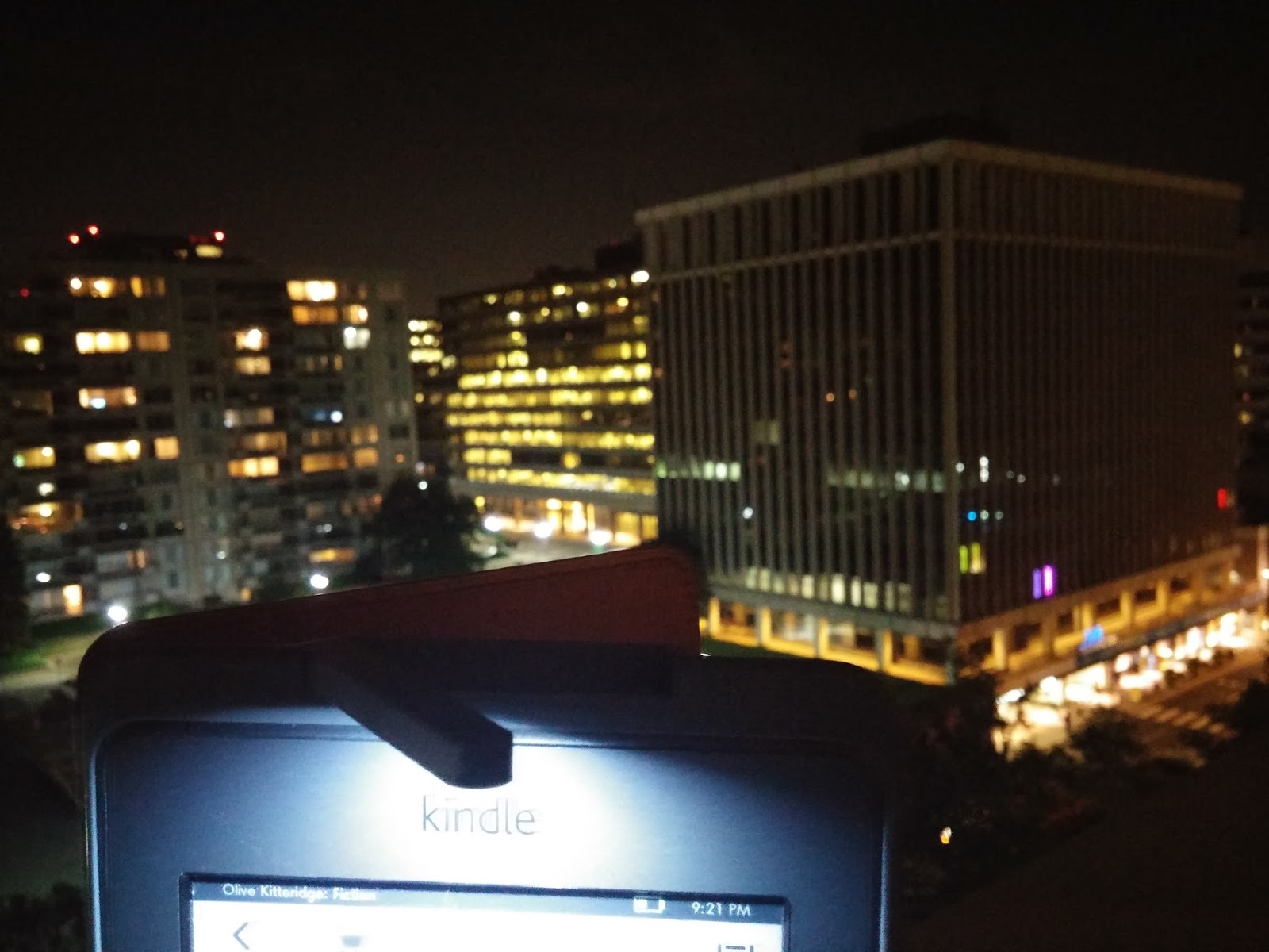 Reclined on the patio chair with my feet propped on the other chair, hearing screams from the drunk man who lives in the tunnel down the street and the lyricless music playing through the Bluetooth speaker on the bistro table next to me, my attention occasionally altered by a plane taking off at the airport one mile away or the flickering television through the window of an apartment dweller across the way, I read Olive Kitteridge on my Kindle Touch going on three hours now. It is a Friday night and I am across the river from the most powerful city in the world and I am not texting friends "What are you up to tonight?" or flicking my thumb right or left on an LED screen. I sense that I have a complete absence of pain and discomfort. I sense that the world around me is huge, and the world described in the book's words are large, and that I am small, so small that I feel elated knowing there are few places I would rather be right now.