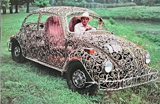 In the meantime, I also received a postcard of a Wrought Iron Volkswagen bug from Barbara Reynolds. She does find some innovative images. Apparently, a guy named Joe Gomez was inspired by a dream and spent 9-months building this VW. He was trying to sell it according to Barbara’s postcard and the car appeared in a book and film entitle WILD WHEELS by Harrod Blank of El Cerrito, CA. In Barbara’s words: