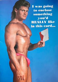 Reed’s card was funny. A not-so-sexy guy on the cover (at least NMT-Not My Type) with the words imprinted on the cover: I WAS GOING TO ENCLOSE SOMETHING YOU’D REALLY LIKE IN THIS CARD...