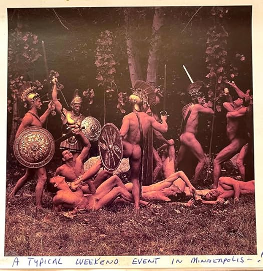 And former coworker and friend from Pac Bell Yellow Pages, Reed Campbell, never fails to make me laugh. He sent a card of these naked Roman warriors in a forest with swords and armor and Reed wrote: A TYPICAL WEEKEND EVENT IN MINNEAPOLIS! He’s always full of surprises. I am sometimes taken aback.