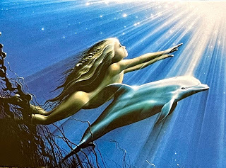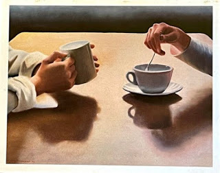 That song by TAKE THAT has caught my ear called BACK FOR GOOD. I like when they mention ‘coffee cup’ in the lyrics. And Dorothy Rua, is back, too. She sent four cool cards recently: Coffee cups; a cool, unusual guy riding ice-blocks in Paris, a mermaid girl with a dolphin chasing the light and a couple from yesteryear, enjoying a cup of coffee under a shady tree (or was it afternoon tea?).