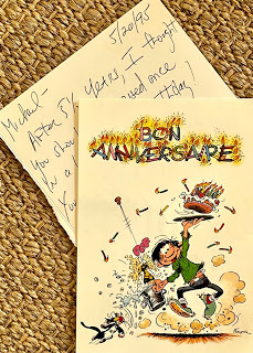 Alan also wrote a few early words for my forthcoming Birthday, using a cool postcard from LA TERRASE AU SOLEIL in Ceret, France (where we had stayed the last time we were in France). Alan had forgotten his shoes there and he never forgets when I said, “Well, I guess they weren’t that important to you---otherwise, you wouldn’t have forgotten them!” I know he didn’t like that I said that at the time—but we can laugh about it now.