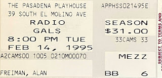Alan and I had a splendid time. We had an early dinner for Valentine’s Day at a place called RAYMOND Restaurant in Pasadena, CA. After the meal we went to the PASADENA PLAYHOUSE and saw a show called RADIO GALS. The musical takes place in 1927 in the small town of Cedar Ridge, Arkansas. It made me recall my trip to Arkansas when I was 13-years old when I accompanied my Uncle Richard and Aunt Pat and cousin, Mandy, on a summer road trip. Aunt Pat’s family was from there—talk about a HEE HAW “Life”!