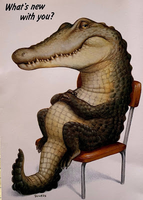 They say time slows down at times of great danger, almost like Neo being able to see and dodge bullets in THE MATRIX. That was just an illusion, of course. Time is constant. This time illusion was caused by how we store memory. The richer and denser the memory of an event—for example, during moments when you are terrified—the longer you perceive that event lasted. This phenomenon also explains why time seems to go faster as you age. When you're a child, experiences are new and so your memories are fresh and intense—so again time seems to slow down. As you grow older, especially when you are stuck in a routine, very few new or vibrant memories are being laid and so time flies by. That’s why when a child looks back on summer, it seemed to last forever. For adults, it’s barely a blink. --Harlan Coben, RUNAWAY Reed Campbell sent a simple card that made me laugh. It pictured a crocodile with the copy reading WHAT’S NEW WITH YOU? And inside it was imprinted AROUND HERE, IT’s THE SAME OLD CROC...