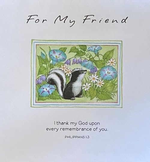 Aunt Lela wrote again. She sent a cute friendship card with an illustration of a skunk. Hmm...