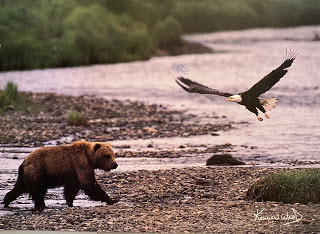 Former co-worker, Reed Campbell, from Pac Bell Yellow Pages sent me a nice postcard from Alaska. I liked the photographic nature look of the eagle in-flight and the wild bear. It’s a scene I certainly never see. Reed wrote: