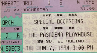 On June 7th, Alan and I went for an early RAYMOND dinner in Pasadena and then to the Pasadena Playhouse where we saw the show SPECIAL OCCASIONS by playwright Bernard Slade. It explored the story of a couple’s divorce over a ten-year period and how they struggled to be friends as they often bumped into each other during special occasions (funerals, birthdays, etc.). I often wondered if the stars in these plays will become bigger stars. This one starred Caroline McWilliams (as Amy) who is married to an actor, Michael Keaton (known for BATMAN RETURNS). Michael Keaton actually has an account at Charles Schwab & Co. Caroline divorced Keaton in 1990 so I imagine this play was an easy slice of her personal life. They had married in 1982 and had a son named Sean Keaton born in 1983. The actor in the lead of the play was played by Steve Vinovich. I don’t know much about him but maybe his stage and/or screen presence will grow over time. Alan and I enjoyed the play but I imagine it had more of an impact for Alan given the recent closure of his divorce a few years ago. Photo: Caroline McWilliams and Steve Vinovich
